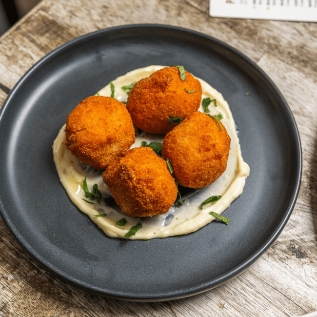 Crispy, golden risotto balls stuffed with smoked mozzarella and served with a aioli dipping sauce.