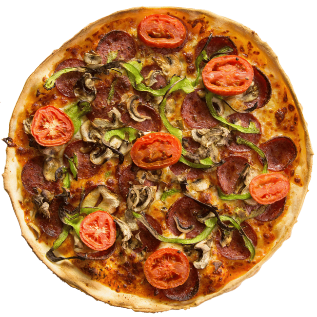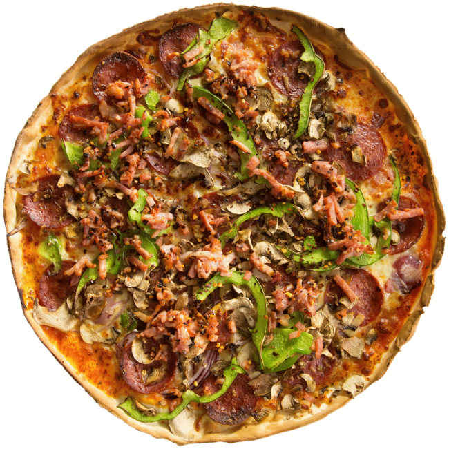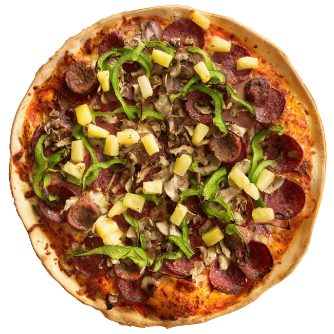 A loaded favourite: mushroom, capsicum, onion, pepperoni, ham, lamb sausage & pineapple.