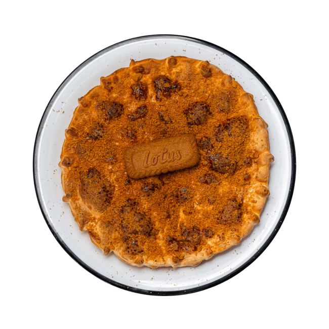 A dessert pizza with a biscoff creamy spread topped with Biscoff cookies