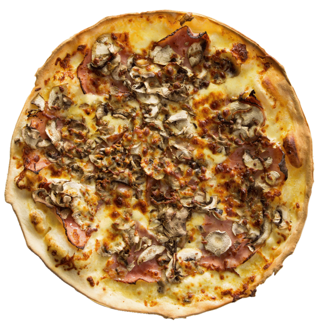 A rich, creamy base topped with mushrooms and ham