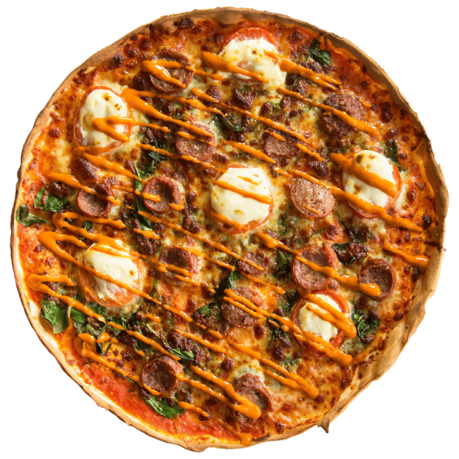 A spicy pizza with lamb sausage, spinach, tomatoes and marcapone, finshed with a drizzle of our harissa sauce