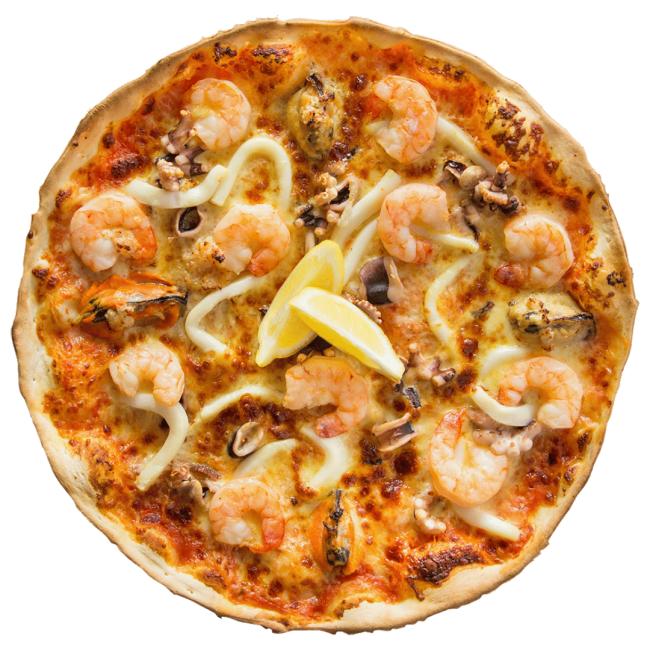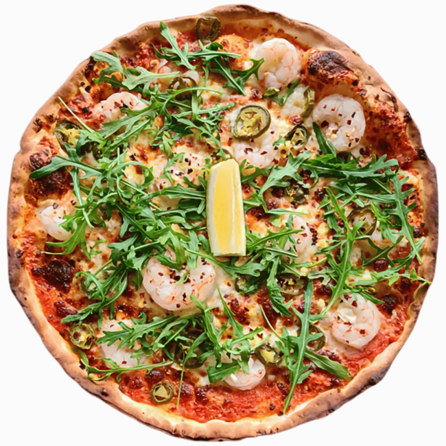 Prawns, Jalapenos, garlic, fetta and mozzarella topped with baby rocket and a wedge of lemon. Spicy!