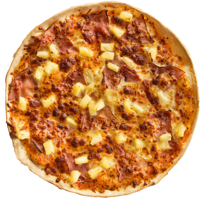 A tropical favorite with ham, pineapple, and melted cheese on a classic tomato base.