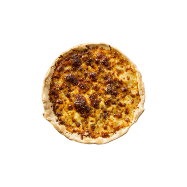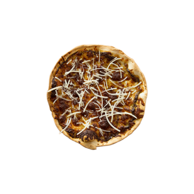 A bold pizza with seasoned ground beef, jalapeños, salsa, and sour cream.