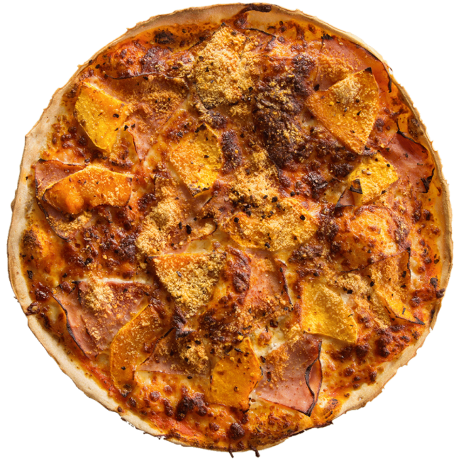 Ham and roasted pumpkin with chilli and a sprinkly of parmesan