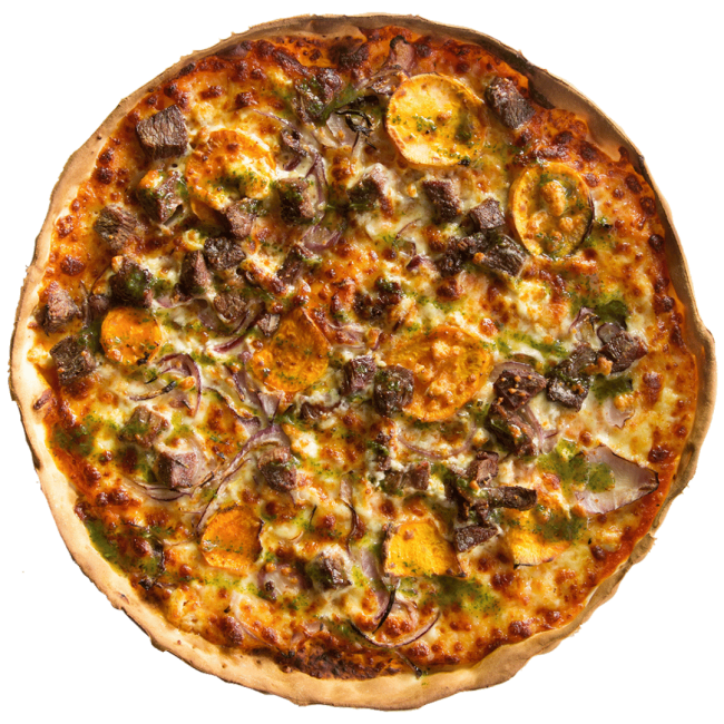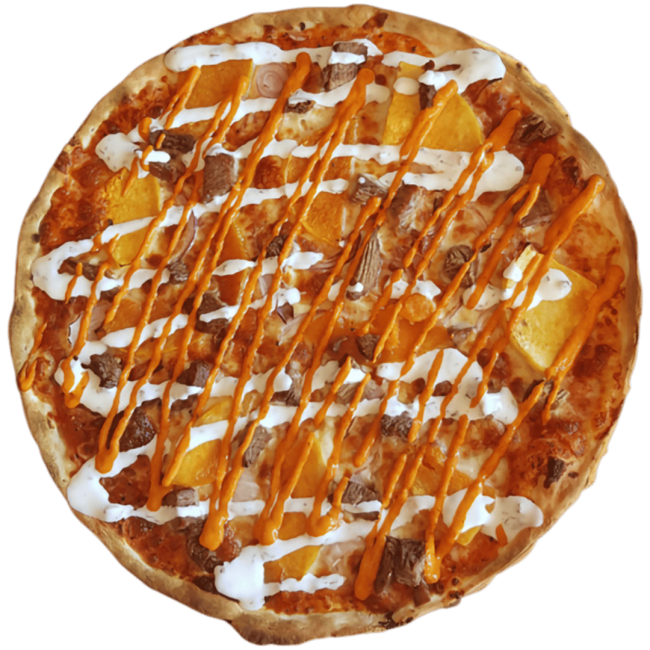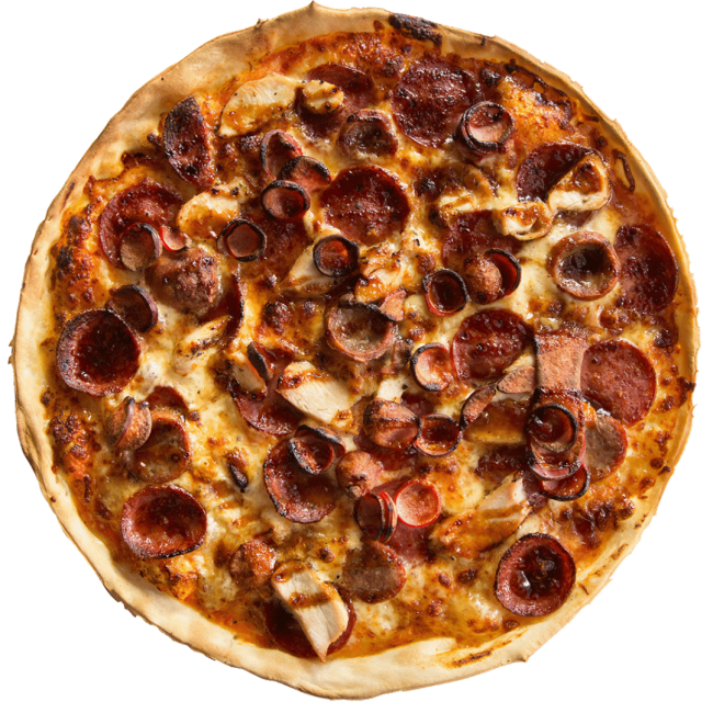 Stacked with pepperoni, chicken, lamb sausage and cabinossi, drizzled with BBQ sauce.