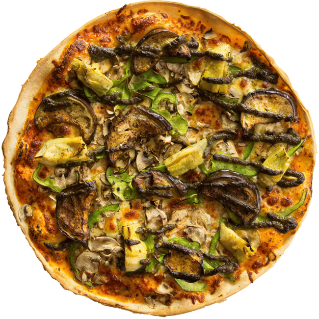 Veggie-packed with capsicum, artichokes, eggplant and mushroom finished with pesto.