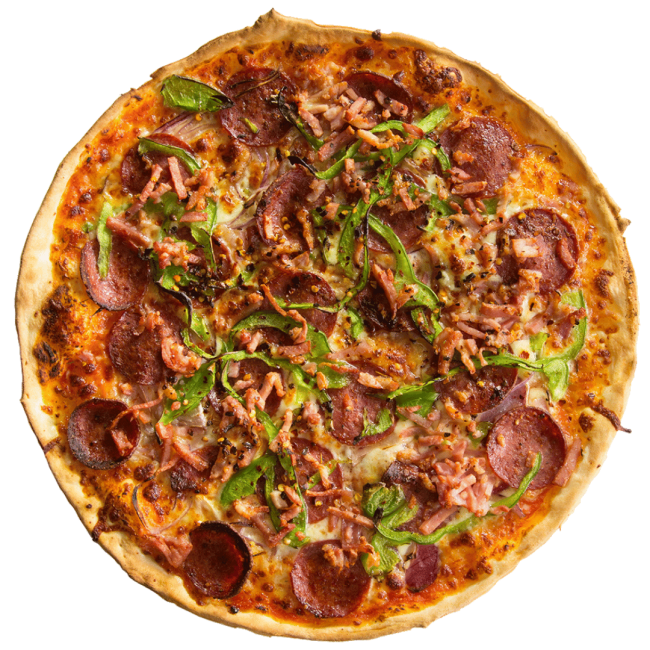 Pepperoni, onion, capsicum and bacon with a chilli spark.