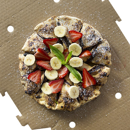A decadent dessert pizza topped with Nutella spread and finished with fresh strawberries and banana