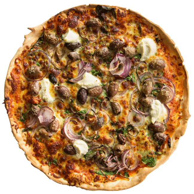 Though all care is taken during preparation, due to our environment we cannot always guarantee 100% gluten or nut free products. Our Vegan fetta and pesto products contain nuts. Olives used in menu may contain pits. Our tomato base contains onion and garlic. Please inform staff for any dietary requirements or allergies.