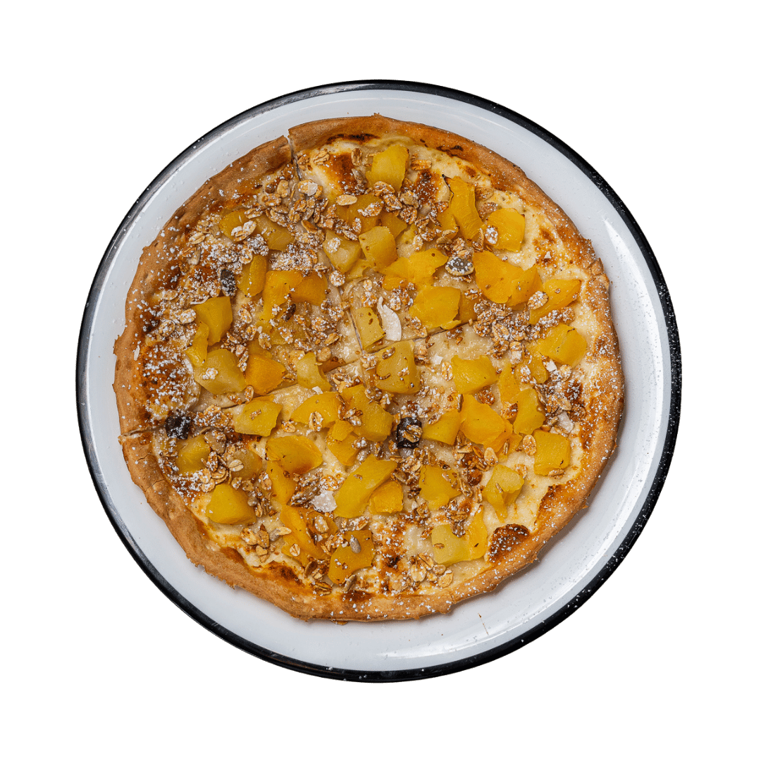 A sweet dessert pizza with cinnamon-spiced apples and topped with roasted granola and a dusting of icing sugar.