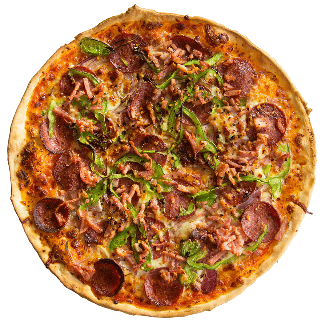 Pepperoni, onion, capsicum and bacon with a chilli spark.