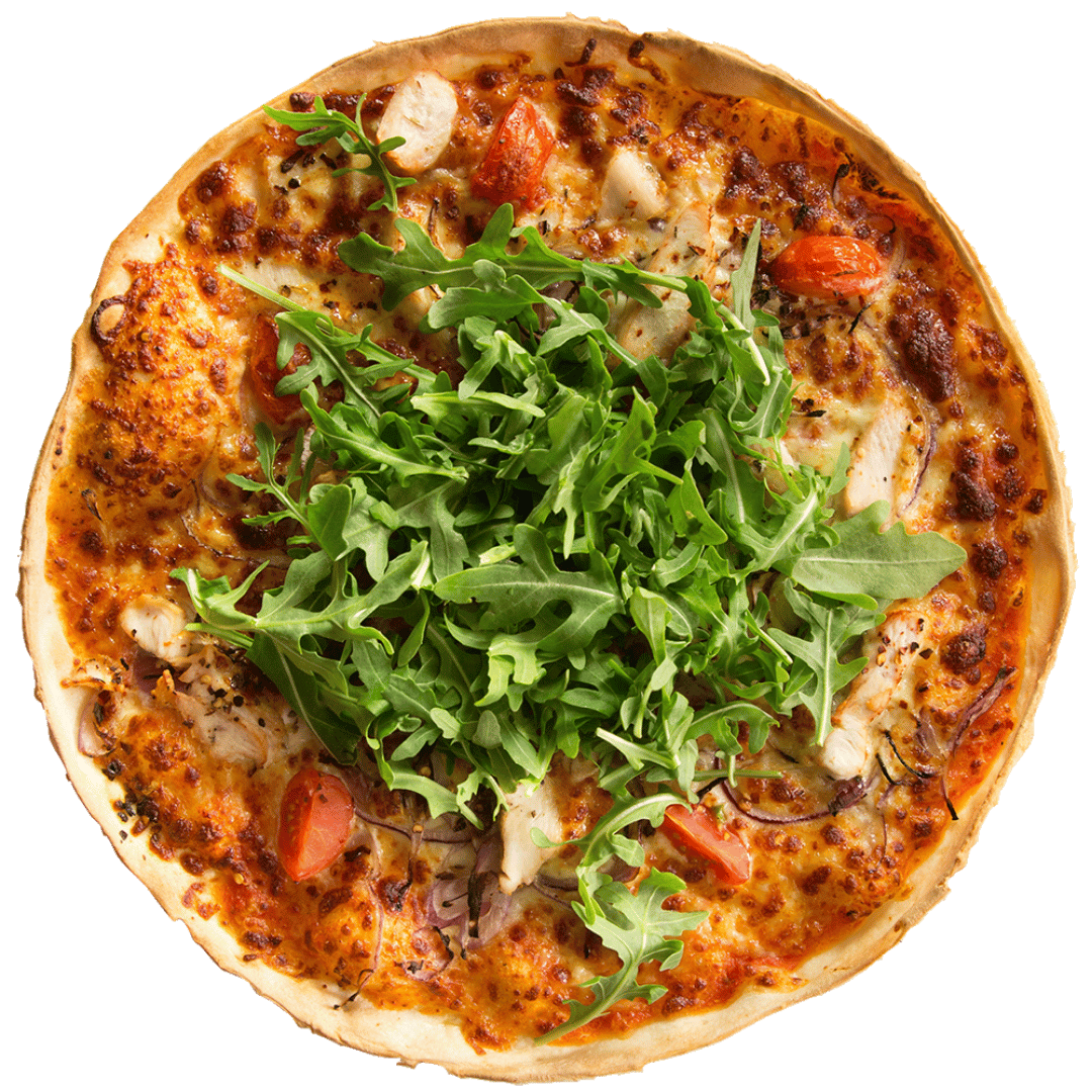 Chicken with cherry tomato, red onion and chilli, topped with fresh rocket.